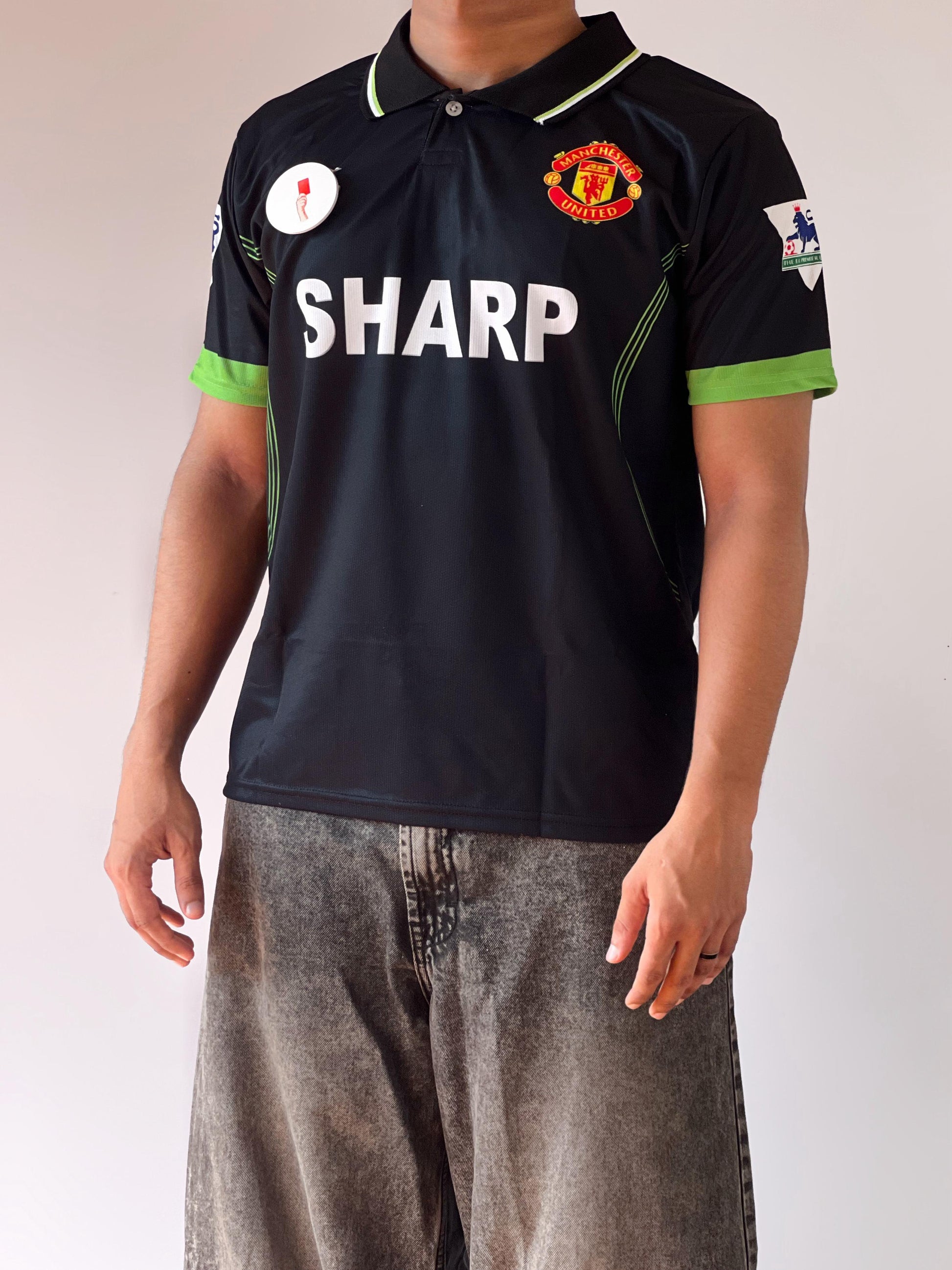 Relive the glory days with this iconic 1998 Manchester United away jersey, famously worn by David Beckham. Featuring the classic SHARP sponsor logo, Premier League patches, and Umbro branding, this black shirt with green accents is a must-have for any true United fan. Perfect for collectors, matchdays, or casual wear.
