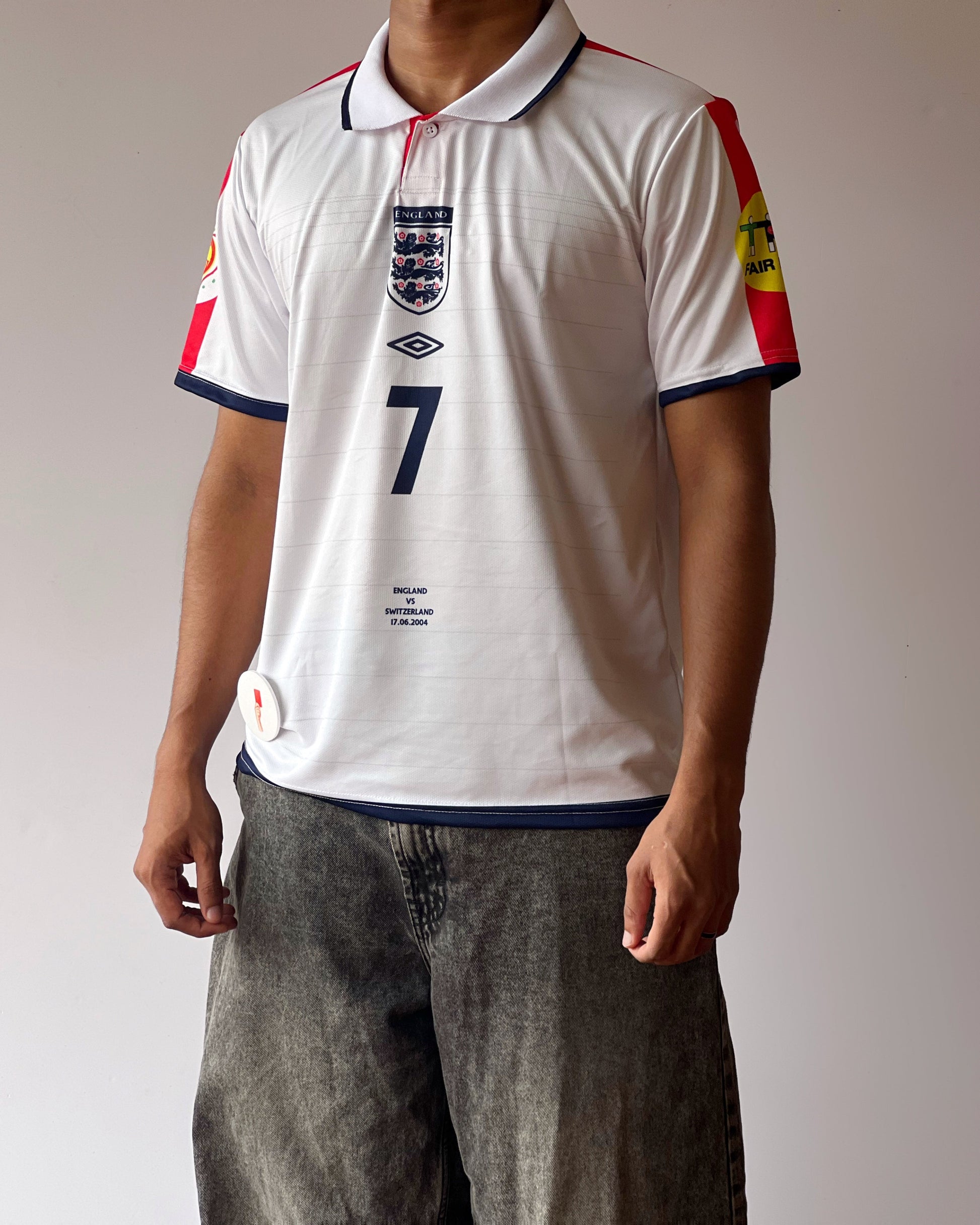 Step into Euro 2004 nostalgia with this iconic England #7 jersey. Inspired by Beckham’s legendary performances, this classic kit features the vintage Umbro design, crisp white finish, and detailed matchday embroidery from the clash against Switzerland.