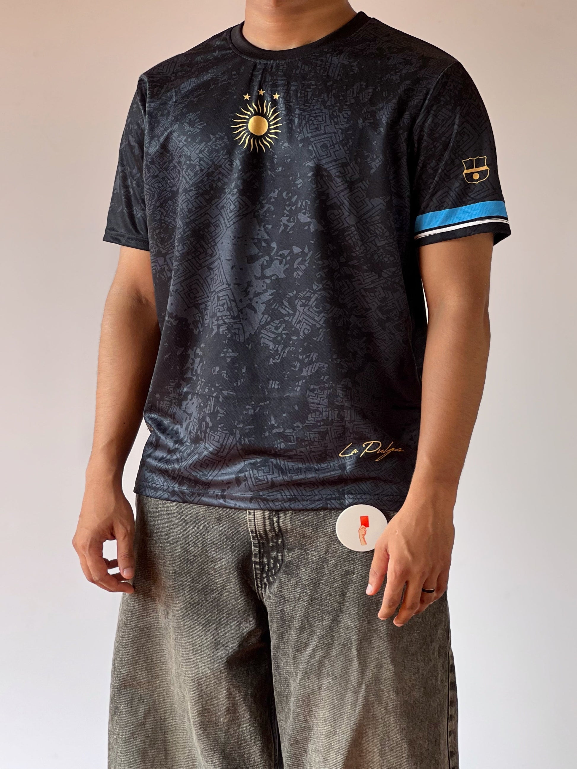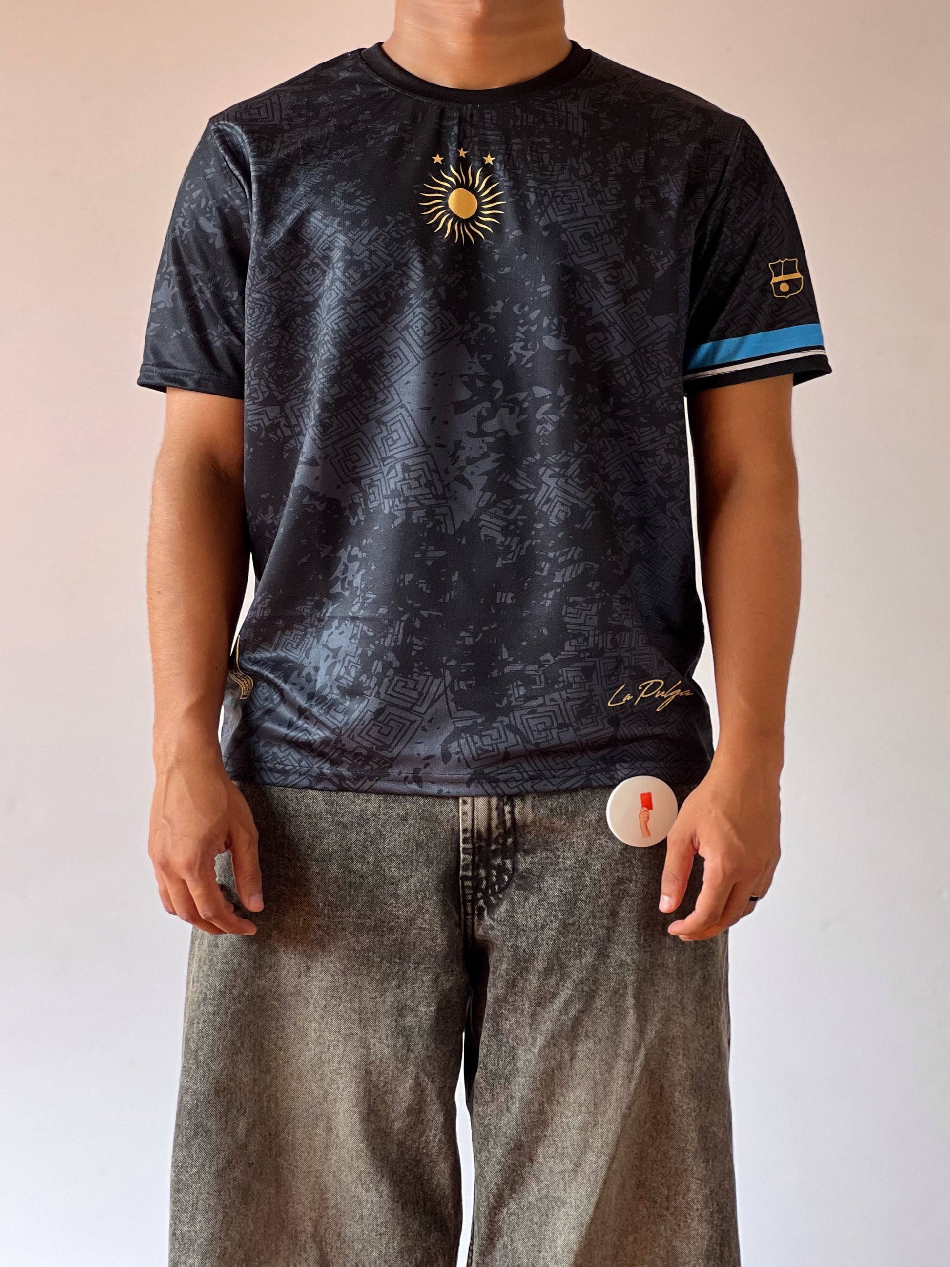 Pay homage to greatness with the Black La Pulga Jersey. Featuring a sleek all-black design with deep graphic patterns, the shirt is detailed with a radiant sun crest and subtle “La Pulga” gold signature. Finished with light blue sleeve trim and an exclusive arm badge, it blends elegance with football legacy.